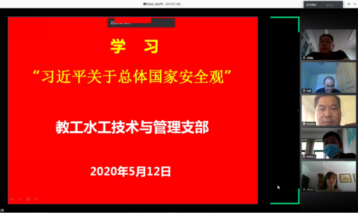 2020年05月12日下午4:00,水利工程学院教工水工技术与管理党支部全体党员通过腾讯会议直播的形式在线学习形式召开了学习《习近平关于总体国家安全观论述摘编》活动,活动由教工水工技术与管理党支部书记王建伟主持,支部全体党员参与了本次会议。