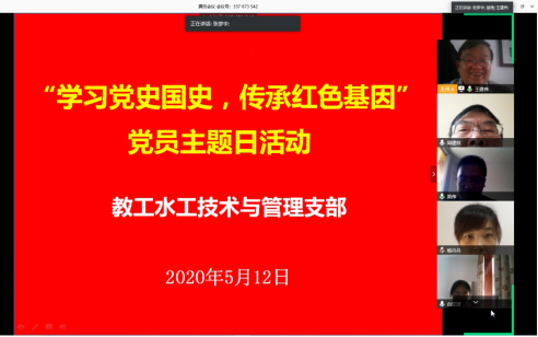 为加强党的历史教育,学习和继承党的优良传统,增强党性修养。2020年05月12日下午3:00,水利工程学院教工水工技术与管理党支部全体党员通过腾讯会议直播的形式在线学习形式召开了“学习党史国史,传承红色基因”党员主题日活动,活动由教工水工技术与管理党支部书记王建伟主持,支部全体党员参与了本次会议。