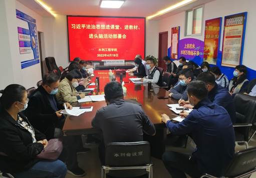 为深入学习贯彻习近平新时代中国特色社会主义思想,落实习近平总书记关于教育的重要论述和习近平法治思想,做好法治教育宣传活动,2022年4月19日下午,水利工程学院召开习近平法治思想进课堂、进教材、进头脑活动部署会。水利工程学院院长雷恒、各教研室主任、专业带头人及骨干教师代表参加了会议。