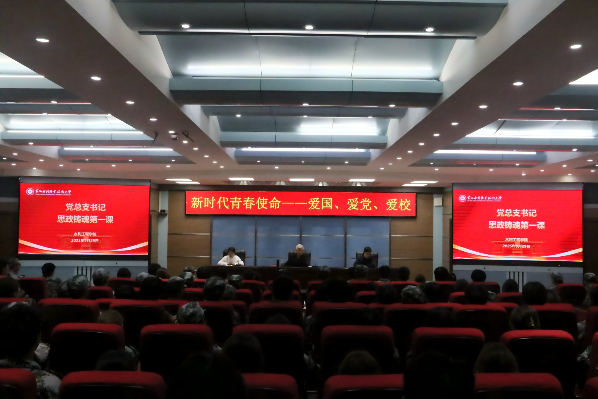 9月29日晚,水利工程学院党总支书记王建设以《新时代青春使命——爱国、爱党、爱校》为题,在水利报告厅为2025级新生代表讲授了一场深刻的“开学第一课”。本次活动旨在加强新生思想引领,夯实学生干部队伍建设。