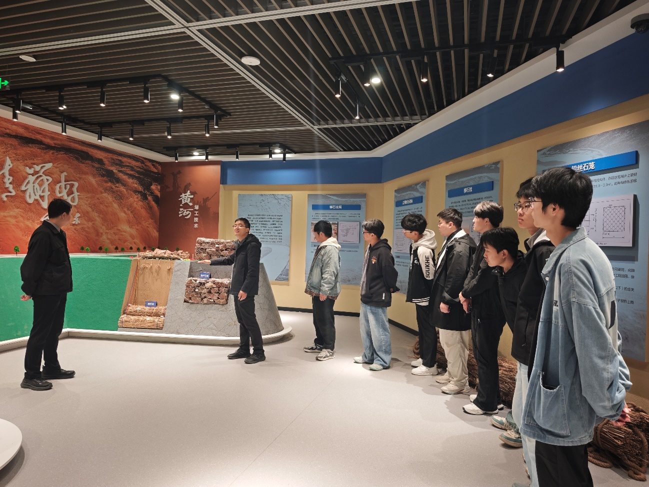 在学院副院长谭建领和党总支副书记李建的带领和讲解下,同学们沿着黄河工程文化长廊,系统学习了波澜壮阔的治黄历程。通过现场观摩与讲解,大家直观感受到黄河治理理念与工程技术的演进,深刻领悟了“忠诚、干净、担当,科学、求实、创新”的新时代水利精神。