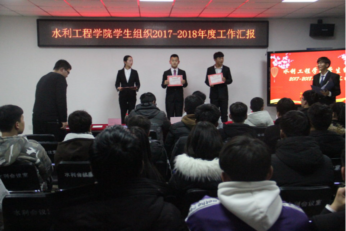 会上,水利工程学院分团委书记万勋老师首先讲述了本次学生组织工作汇报的意义及对以后工作开展的重要性,肯定了部室所取得的成绩,同时也指出了不足之处,他希望水利工程学院各学生组织要发挥好“一心双环”的团学工作模式,要心有水利,胸怀责任为实现历史复兴的水院梦凝神助力。之后由各个部室有序的汇报本部室的工作,各部室主要以PPT和个人演讲的形式展现了部室在本学期所取得的成就以及工作完成情况。之后黄校学生会副主席娄小波对本次汇报做了总结,他希望在座的团学干部要本着“锻炼学生能力、不耽误学习”的原则,积极开展各项工作,“不待扬鞭自奋蹄”,争取在下学期工作中取得更大的进步。最后,由评委代表为综合成绩前三的优秀部室颁发了荣誉证书。