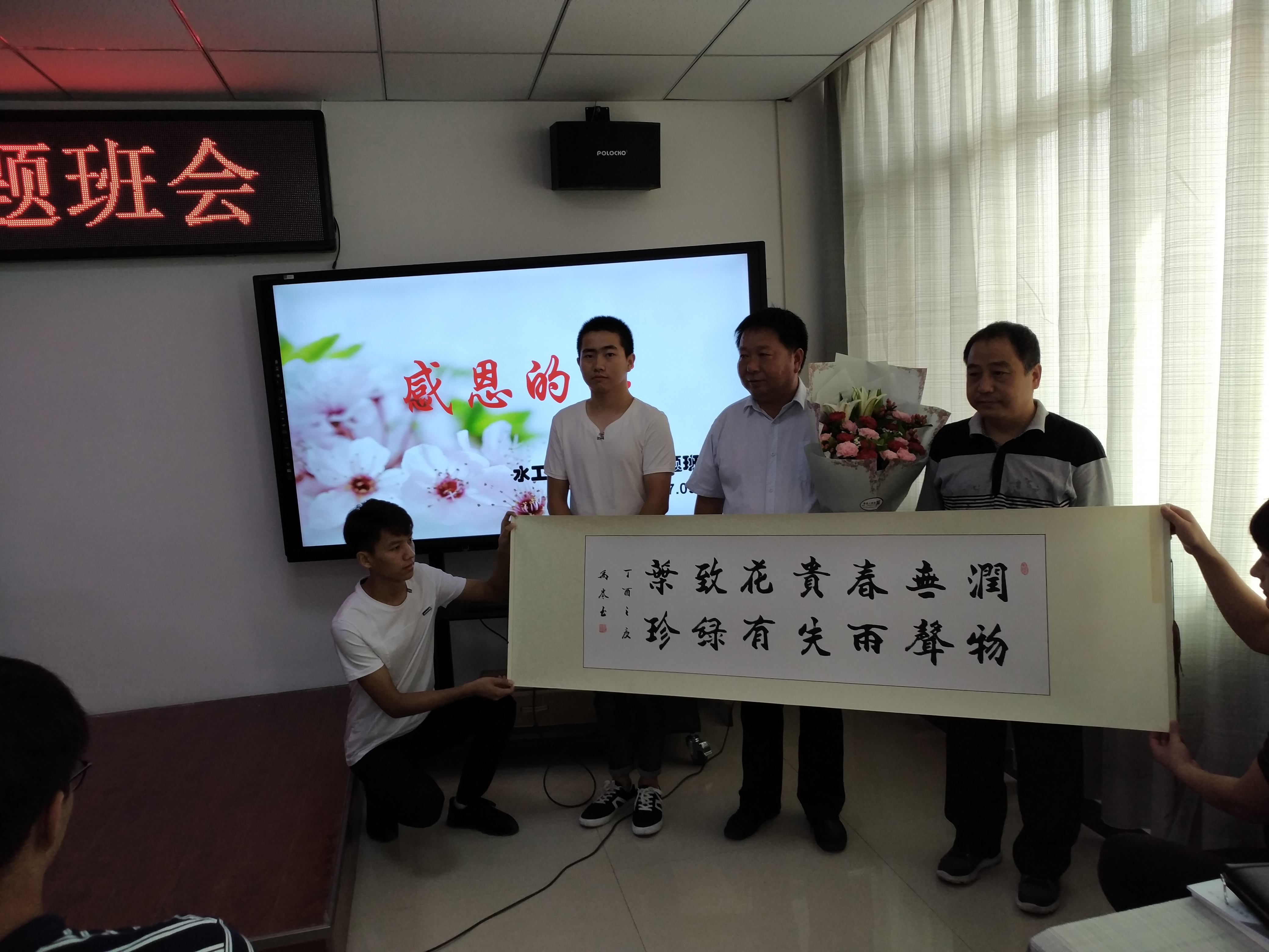 此外班级还进行了欢迎转校新同学蒋楷林,为他赠送水利工程学院院服。为保证成杰不掉队,楷林尽快融入快乐友爱的集体,班级成立了由石伟、闫丰、张牧羽等同学组成的帮扶小组。最后为表达对老师们的敬意,班长提议全体同学起立,向老师们深鞠躬,情真意切地道一声“老师您辛苦了,谢谢您!”