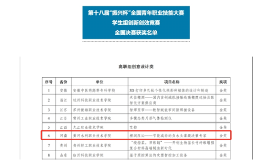11月10日至11日,第十八届“振兴杯”全国青年职业技能大赛学生组创新创效竞赛全国决赛在河南郑州举行落下帷幕。我校水利工程学院项目《根润压沁——节能减排的负水头灌溉决策专家》荣获高职组创意设计类全国金奖。这是我校首次在该项赛事中荣获全国金奖,实现了新突破。