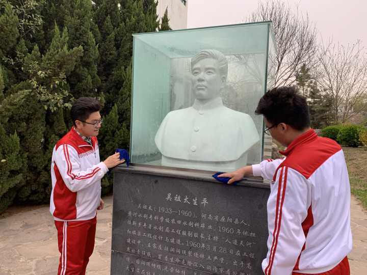 首先由水利工程学院学生干部代表田杏雨在吴祖太烈士的雕像向大家介绍了吴祖太烈士的先进事迹并带领大家集体宣誓,激励全体学生向吴祖太烈士学习。之后,参与仪式人员面向吴祖太烈士雕像默哀1分钟,以此表达对吴祖太烈士崇高的敬意。最后,申书记强调身为新时代的水院学子要牢记烈士的英雄事迹,传承红旗渠精神以及先烈留给我们的宝贵精神财富,珍惜在校学习时间,把握新的发展机遇,在新时代拼搏进取、再创辉煌。