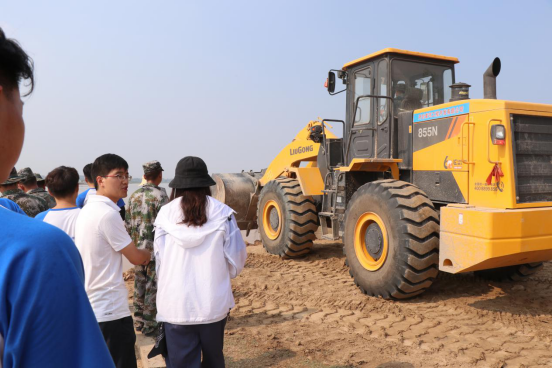 当黄河调研小组到达调研地点之后,正好遇到驻开封部队在进行防汛施工,这是一次很好的调研学习机会,防汛施工的主要工作就是把岸上的石块用推土机推进黄河岸边,这样做的目的是防止汛期内湍流的河水对岸堤的冲刷导致岸堤坍塌,造成不必要的财产损失。