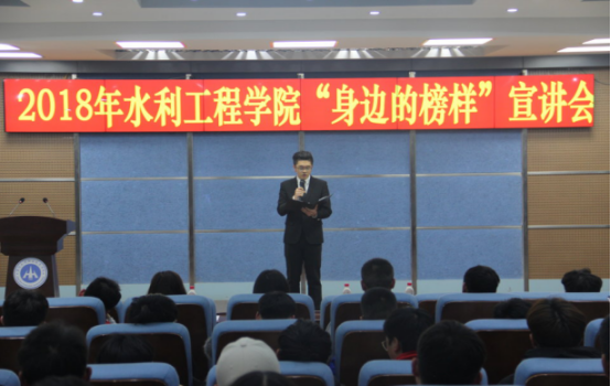 为进一步弘扬榜样精神,让文明礼仪之花绽放在每一个同学身边,2018年12月11日晚上19:30,水利工程学院在SY3301水利报告厅举行2018年水利工程学院“身边的榜样”宣讲会。参与本次会议的有:水利工程学院分团委副书记王官征、水利工程学院学生分会副主席刘亚新、18级各团支部支委会成员以及宣讲人李小艺、胡亚超等七名榜样代表。
