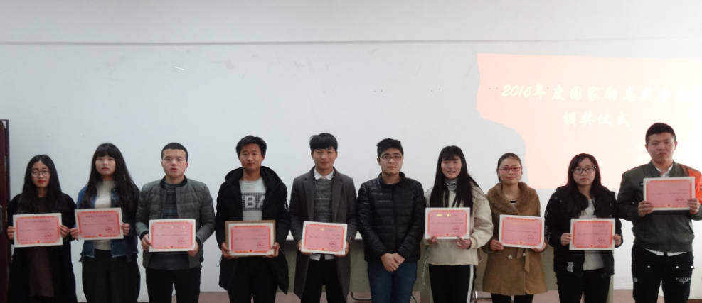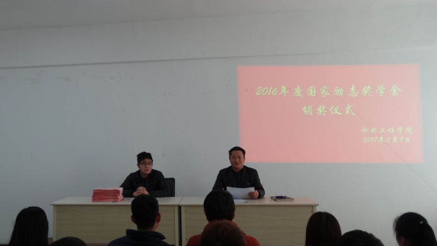 3月9日中午,水利工程学院2016年度奖学金颁奖典礼在SY5310召开。我院刘晗等130余名荣获“国家奖学金”和“国家励志奖学金”的同学参加了此次会议并在大会上受到表彰。水利工程学院党总支副书记楚万强老师、资助负责人王宇老师出席了本次表彰大会。