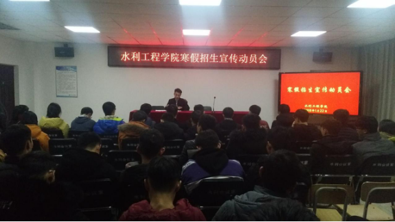 2018年1月22日晚上19:00,水利工程学院在实训楼5310召开寒假招生宣传动员会,参加此次会议的有创新创业部黄耀威、刘亚新、崔体兵及我院大一大二部分学生。本次会议由刘亚新主持。
