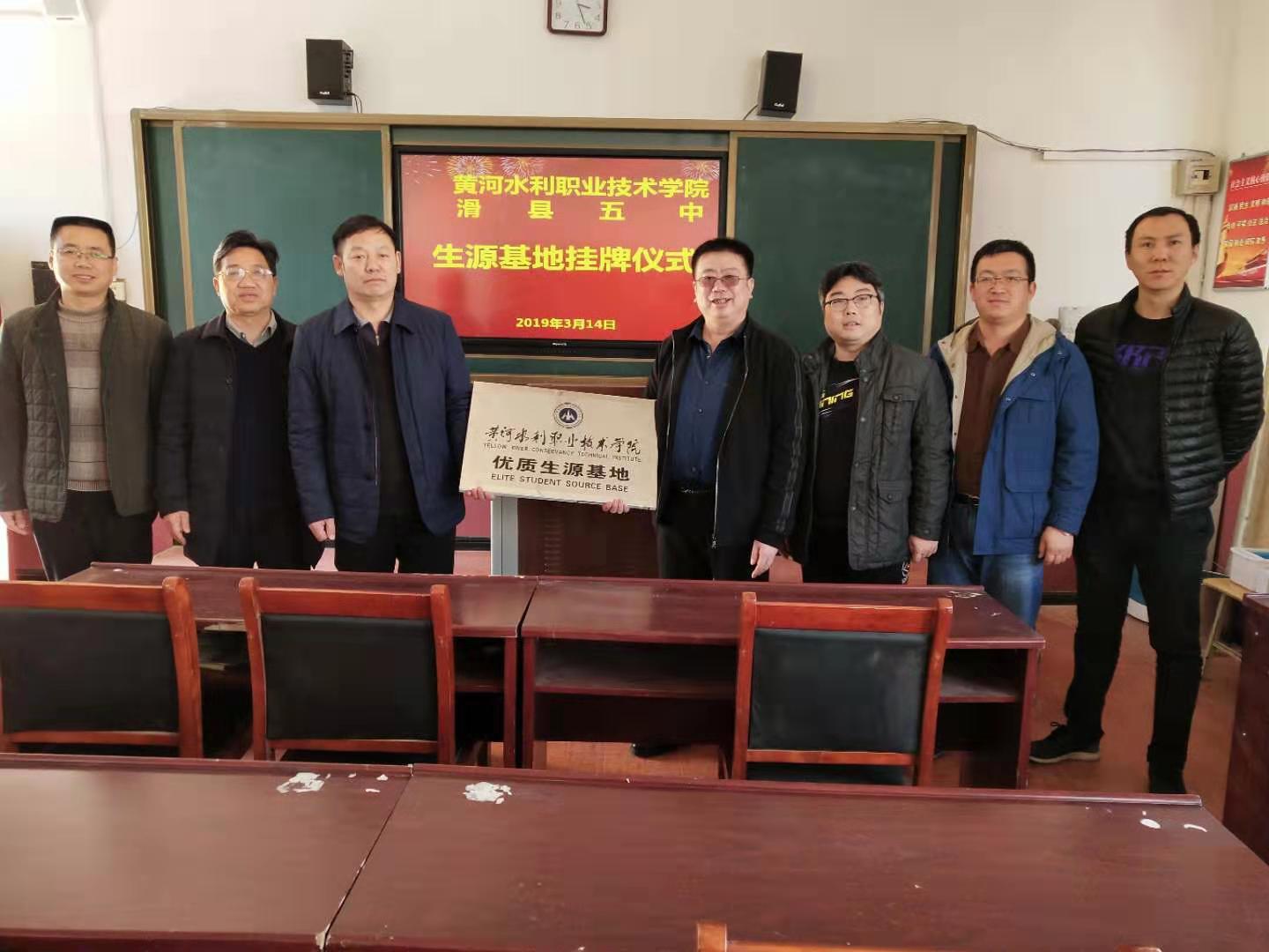 2019年3月,黄河水利职业技术学院“优质生源基地”授牌仪式在滑县五中会议室举行。滑县五中校领导对孙书记一行的到来表示热烈欢迎,双方围绕生源基地建设、招生宣传等议题进行了探讨和交流,表示将以共建“优质生源基地”为契机,充分利用各自的优质教育资源,积极推进优质生源基地建设,为我校输送更多的优秀高中毕业生,为当地培养更多品学兼优的高素质人才。