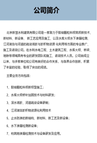 北京新慧水利建筑有限公司是致力于涉水新结构、新材料、新设备、新工艺研发与应用、胶结颗粒料坝、水下检测、渗漏检测和江河湖泊与河道的疏浚、清淤等方面的专业施工及咨询公司。在水利水电工程、土木建筑工程、水库大坝、桥梁、地铁等领域具有专业的研发团队和施工、咨询技术人员。