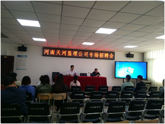 2018年10月17日(周三)下午14:30,河南天河工程监理有限公司在实训楼5310进行专场招聘会。招聘专业:水利工程施工、监理、测量,土木工程,工程预算,城市规划建设等。