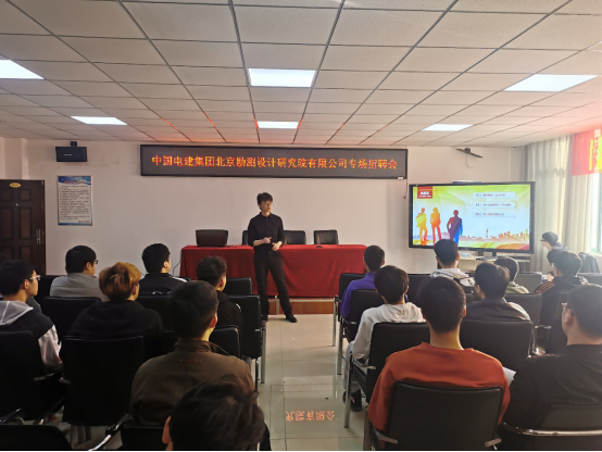 2020年10月10日上午九点,中国电建集团北京勘测设计研究院有限公司在实训楼5310举办专场招聘会。招聘专业:水利水电工程或工程管理等相关专业。