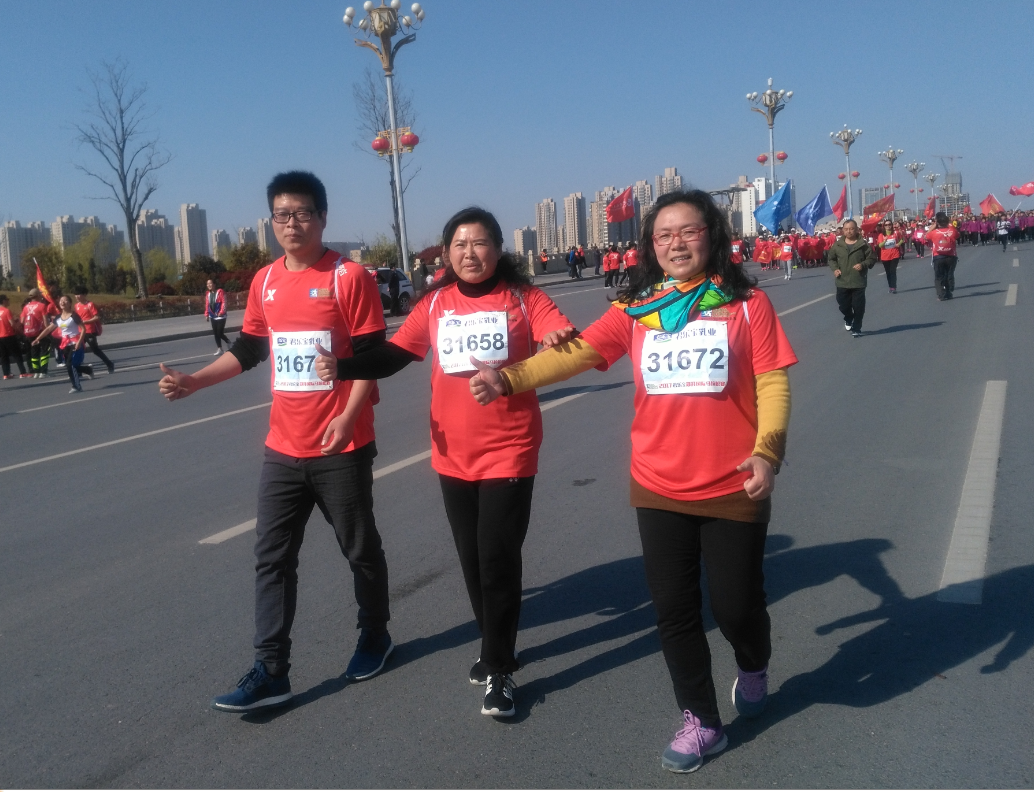 水利工程学院队员(含家属)年龄分布从8岁到55岁,在学校领导王卫东书记的带领下,全体队员从小宋城出发,经过1个多小时的努力,先后经过了金明广场、集英街、汴西湖大桥、第一大街,最后全体队员往返回到出发点小宋城,比赛圆满结束。比赛结束后,全体队员与学校王卫东书记、校工会副主席郭毅、赵彦华合影留念。