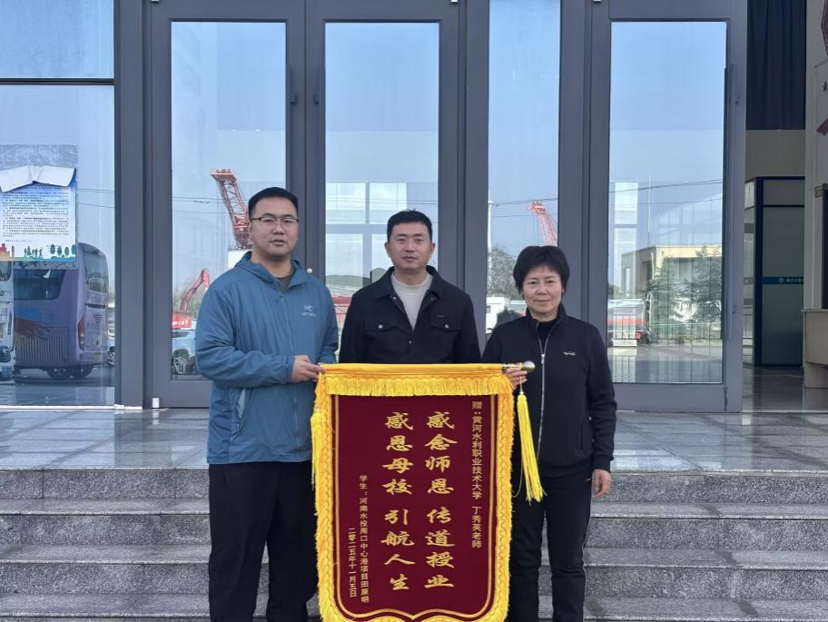 在周口港,我校2018届毕业生田原明工程师向丁秀英教授敬赠锦旗,上书“感恩师德、传道授业,感恩母校、引航人生”,深情表达了对母校与教师的感激之情,也展现了水利人精神的接续传承。