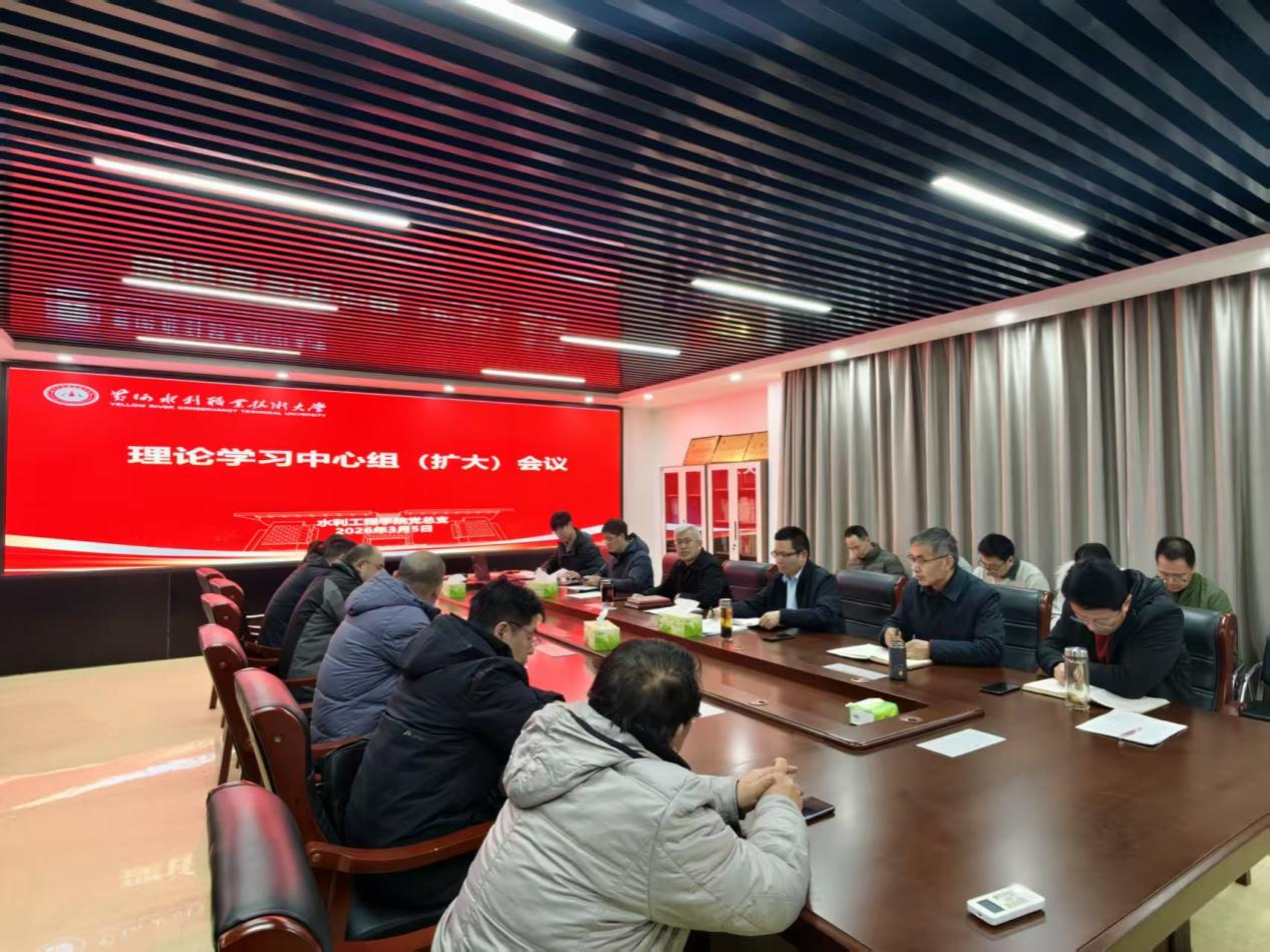 3月5日,水利工程学院在sy3319会议室召开理论学习中心组(扩大)会议,集中学习中央、省委、省委教育工委关于树立和践行正确政绩观的相关文件内容。学院领导班子成员、党总支委员、五办主任及各教研室主任参加会议。会议由学院党总支书记王建设主持。