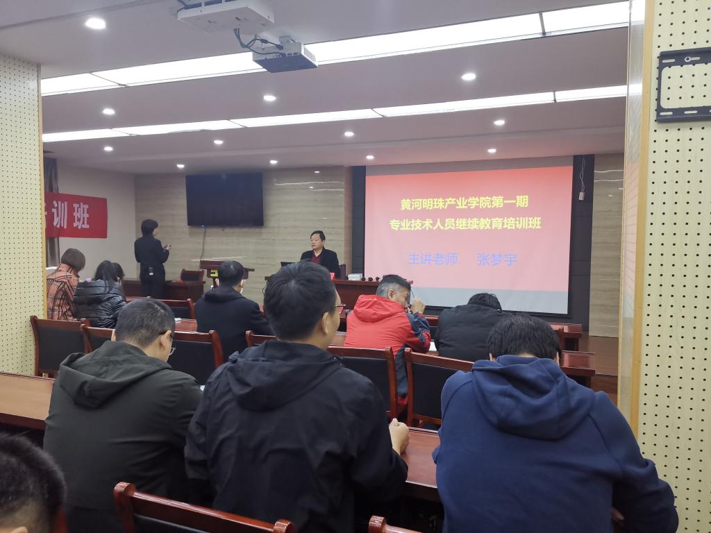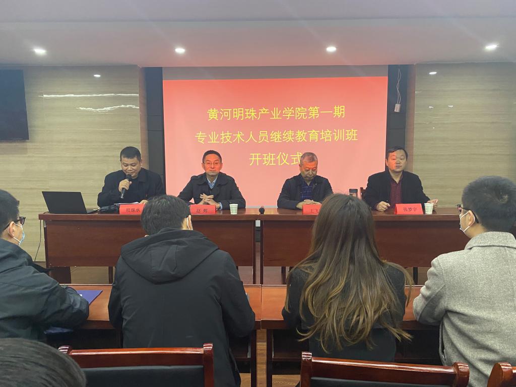 2020年10月18日上午,由我院和三门峡黄河明珠(集团)有限公司(以下简称“明珠集团”)共建的黄河明珠产业学院举行第一期专业技术人员继续教育培训班开班仪式。第一期培训班在三门峡明珠宾馆会议厅召开,明珠集团人才交流中心书记赵辉、人才交流中心主任程继承,黄河水利职业技术学院水利工程学院监理专业负责人王飞寒、造价专业负责人张梦宇和明珠集团65名技术骨干参加了开班仪式。
