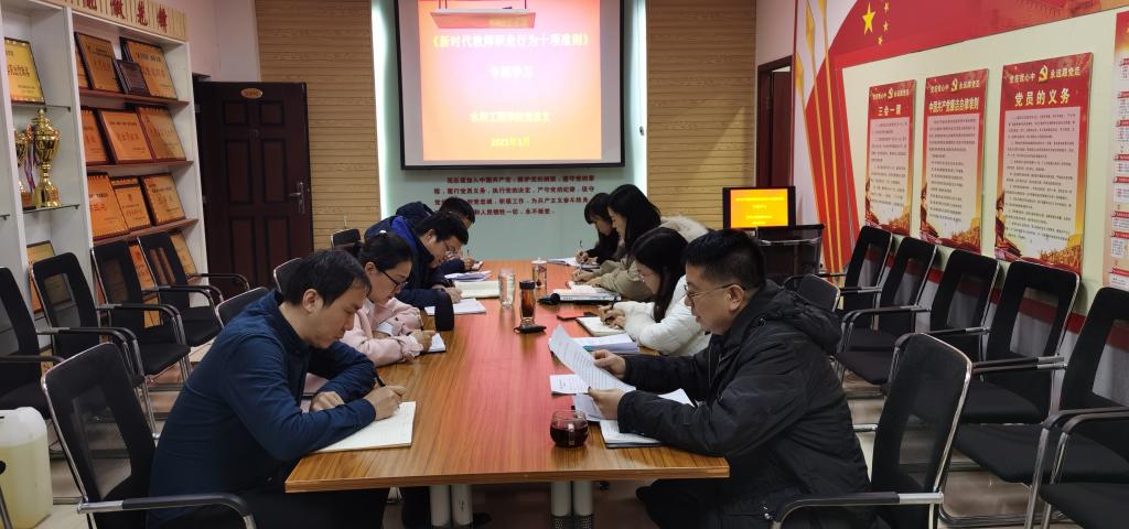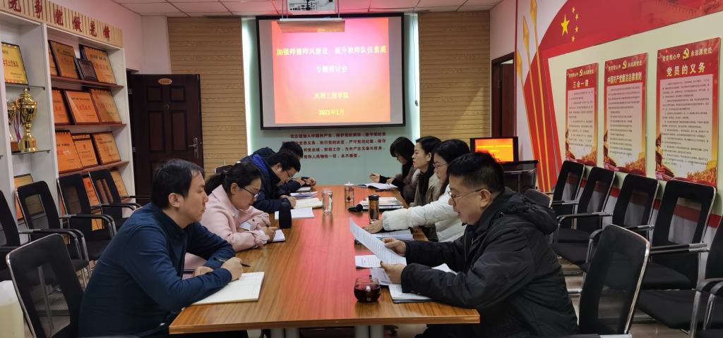 为进一步加强师德师风建设,弘扬新时代高校教师道德风尚,2021年1月4日,水利工程学院党总支在SY5306专题学习《新时代高校教师职业行为十项准则》,学院全体总支委员、三办主任、纪检监察员参加本次学习会,会议由党总支书记孙天星主持。