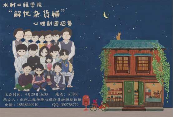 春至沓来,水利工程学院心理剧团精心打造的心理情景剧剧本《解忧杂货铺》《看见你自己》,将代表参加校心理情景剧大赛,现面向全院学生招募演员,具体招募情况如下: