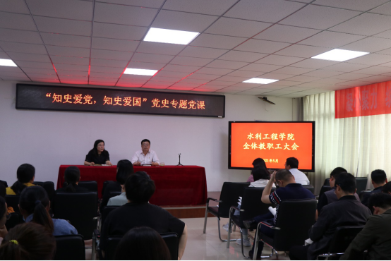 5月11日下午,水利工程学院在SY5310开展 “知史爱党,知史爱国”党史专题党课,学院党总支书记孙天星、院长陶永霞及全院教职工参加了学习教育党课活动。孙天星主讲了本次党课。