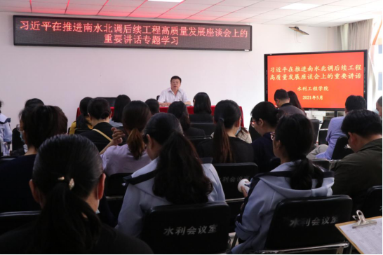 5月18日下午,水利工程学院在SY5310召开习近平在推进南水北调后续工程高质量发展座谈会上的重要讲话专题学习会,学院党总支书记孙天星、院长陶永霞及全院教职工参加了会议。会议由孙天星主持。