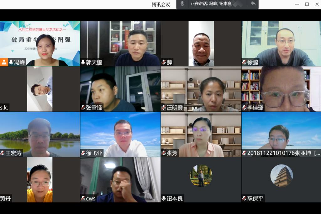 2021年8月23日20:00-23:30,水利工程学院博士团队以 “破局重生 嬗变图强”为主题的博士沙龙,对2021年研究方向开展讨论,博士沙龙由水利工程学院副院长冯峰教授主持,薛绪掌教授和郭天鹏教授作为受邀专家参会,水利工程学院13名博士参加。
