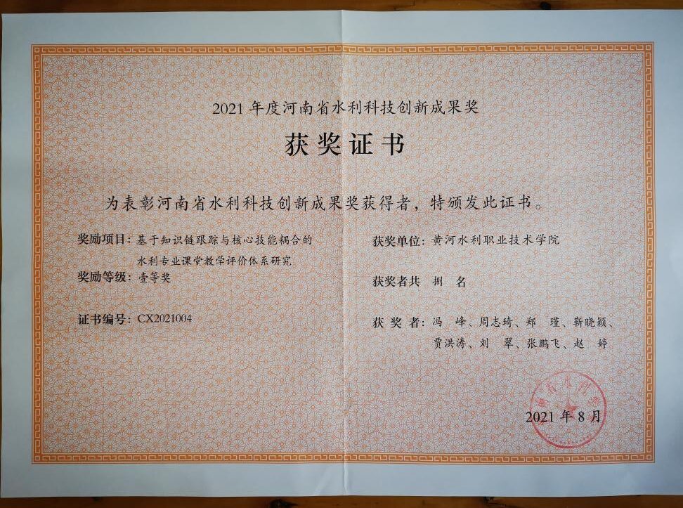 河南省水利学会《关于公布2021年度河南省水利科技创新成果获奖名单的通知》(豫水学〔2021〕18号)近日发布,在单位申报的基础上,经材料初审、专家评审等环节,我院共有2项成果获奖,陶永霞教授主持申报的《快速战备机场跑道新材料应用技术研究》(投融资与工程施工类)、冯峰教授主持申报的《基于知识链跟踪与核心技能耦合的水利专业课堂教学评价体系研究》(科研教学与基础理论类)分别荣获一等奖。