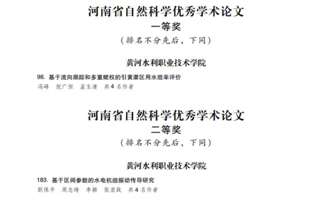 根据《河南省人力资源和社会保障厅 河南省科学技术协会关于表彰河南省第五届自然科学学术奖的决定》(豫人社发〔 2021〕37号)文件,经组织申报、单位初评和提名推荐、资格审查、评委会线上阅评和线下会评等程序,共评出河南省第五届自然科学学术奖 890 项,一等奖共239 项,二等奖共301 项,三等奖共350 项。我校水利工程学院冯峰教授学术论文《基于流向跟踪和多重赋权的引黄灌区用水效率评价》获一等奖,职保平博士学术论文《基于区间参数的水电机组振动传导研究》获二等奖。