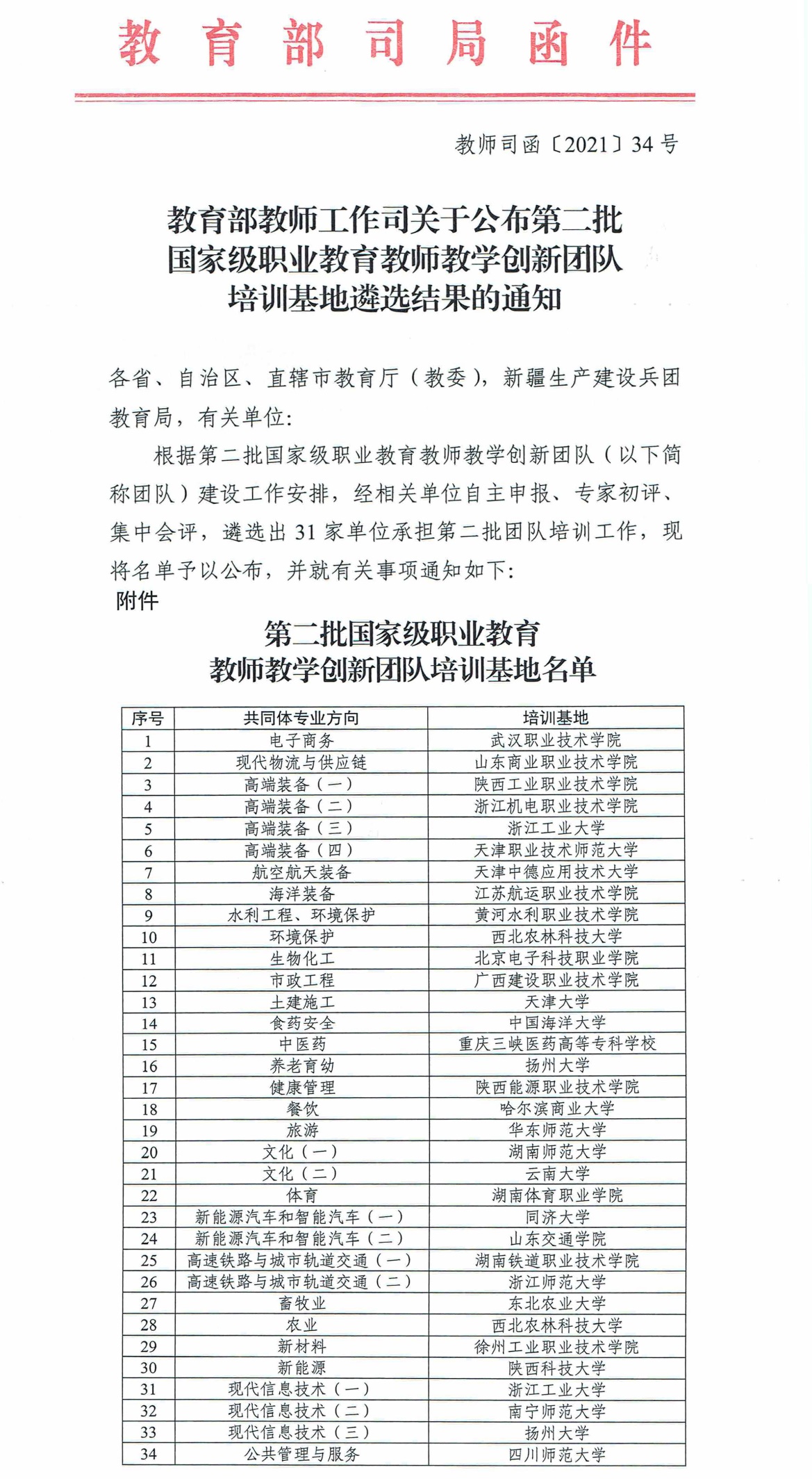 根据第二批国家级职业教育教师教学创新团队建设工作安排,经相关单位自主申报、专家初评、集中会评,共遴选出31家单位承担第二批团队培训工作,我校是水利工程专业方向全国唯一的团队培训基地。