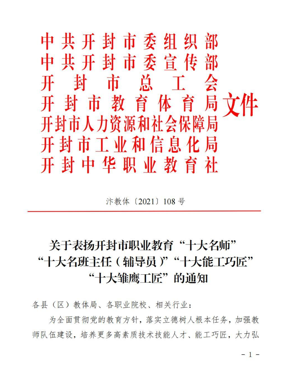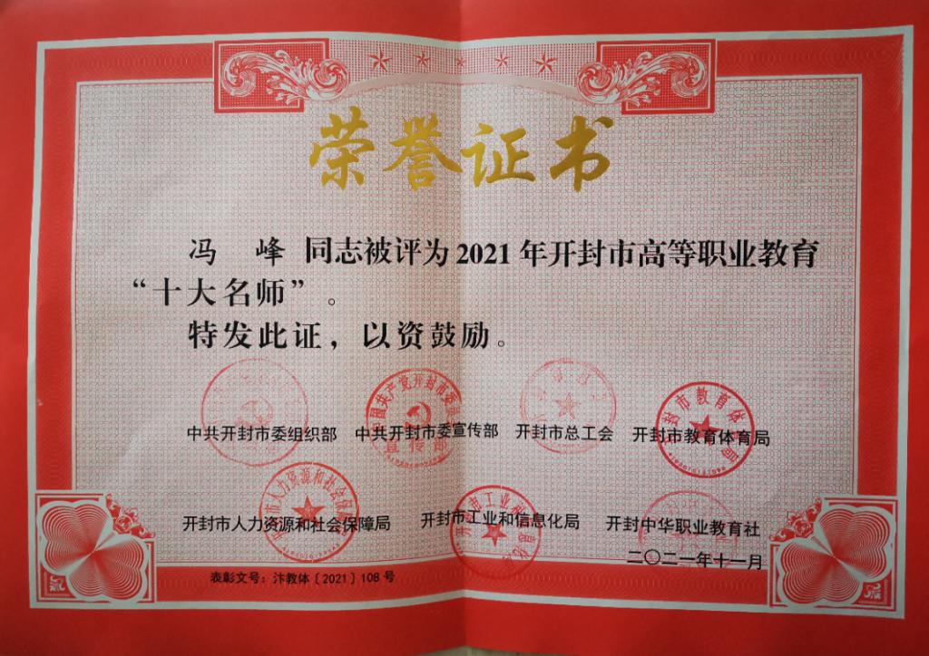 近日,开封市委组织部、宣传部、总工会、教体局、人社局、工信局、开封中华职教社等7部门发布《关于表扬开封市职业教育“十大名师”“十大名班主任(辅导员)”“十大能工巧匠”“十大雏鹰工匠”的通知》,我校水利工程学院冯峰教授荣获开封市高等职业教育“十大名师”称号。