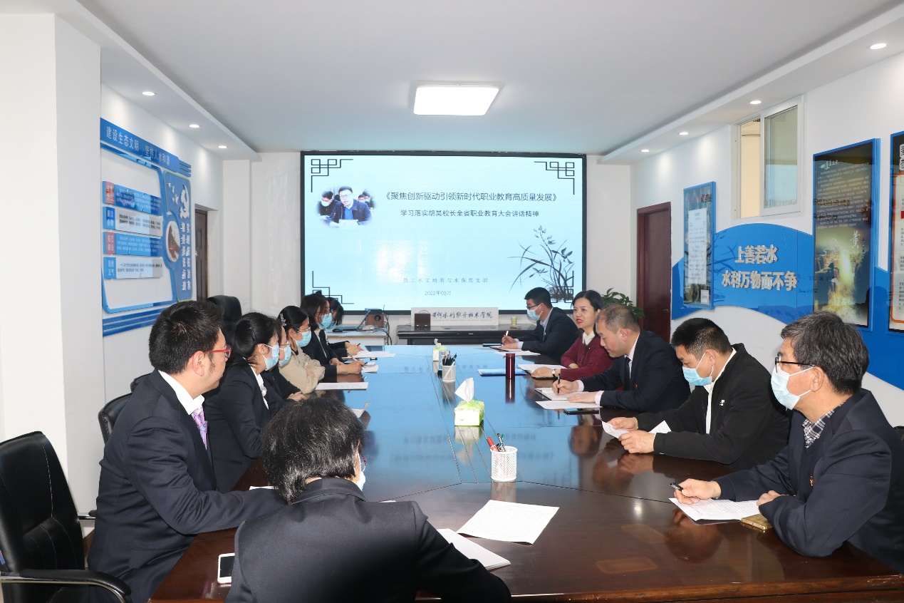支部书记冯峰带领大家通过分段朗读、学中思考、学后讨论方式进行了学习。胡昊校长作为我省职业院校唯一代表,在大会上以《聚焦创新驱动引领新时代职业教育高质量发展》为题,介绍了黄河水院作为全国唯一、河南省唯一、行业唯一的“双高计划”A档(全国前十)建设单位,在双高建设期间高校党建、学校治理、双高建设、专业建设等方面取得的六项成就。根据目前“双高”建设任务,支部党员结合自身的教学科研工作依次进行发言,从职业能力建设、人才培养方式、精品课程构建、1+X技能等级提升以及服务学生、服务学校、服务社会列举了若干举措,为职教品牌树立献计献策,党员同志们也将用实际行动为我省的高等职教事业的发展贡献出自己的力量。