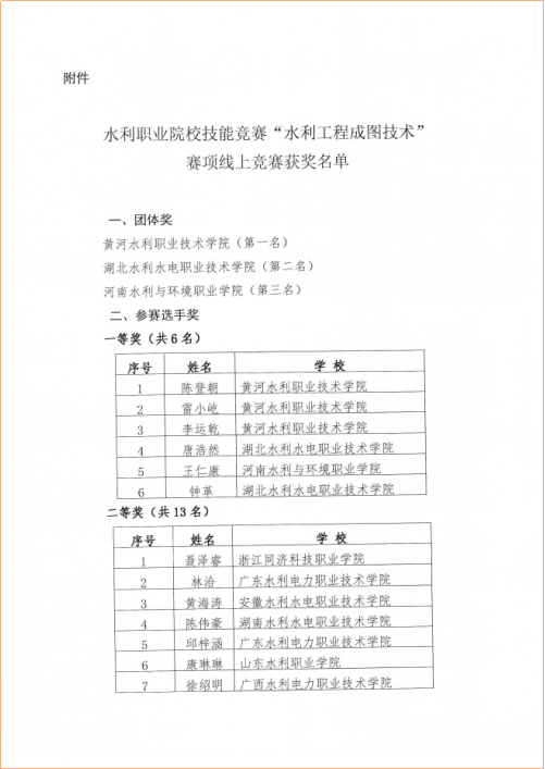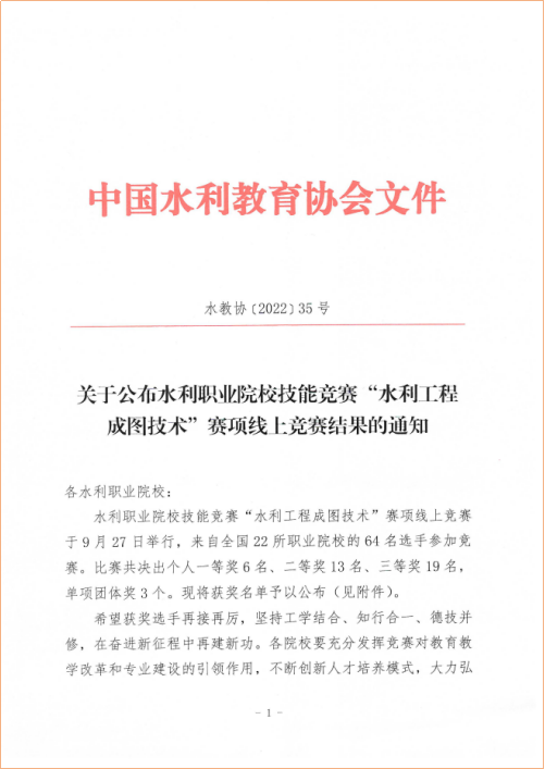 近日,全国水利职业院校技能竞赛“水利工程成图技术”赛项在我校成功举办。此次竞赛由水利部人事司、中国水利教育协会主办,我校承办,共有来自全国22所水利职业院校的200多位选手参加、64位选手参加决赛。经过激烈角逐,我校水利工程制图代表队荣获团体奖第一名并包揽一等奖前三名。