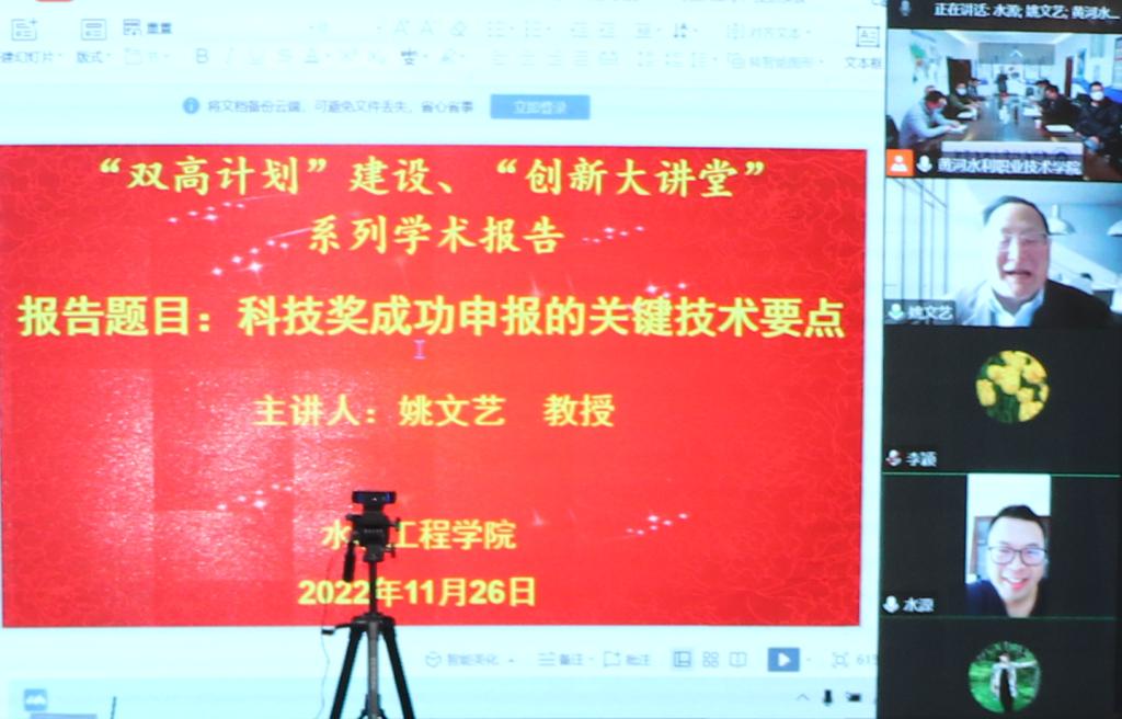 为全面加强我校教师科研工作能力,提升科技成果转化水平,打造高水平教师科研团队,2022年11月26日上午,中原学者姚文艺教授以“科技奖成功申报的关键技术要点”为题为全校教师做了一场精彩的专题学术报告。校长胡昊、科技处、水利工程学院负责人和学校博士团队、各科研平台骨干教师200余人参会。报告会由水利工程学院院长雷恒主持。
