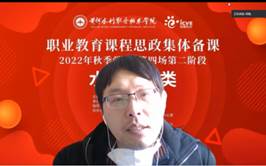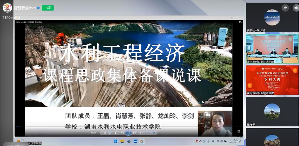 12月17日,由全国水利职业教育教学指导委员会主办的2022年全国职业院校水利大类专业课程思政第二阶段集体备课在我校成功举办。来自全国20余所水利职业院校、第二批国家级职业教育教师教学创新团队协作共同体成员单位、国家级职业教育“双师型”教师培训基地成员单位共计2000余人参加了集体备课。集体备课由中国水利教育协会副秘书长、我校教务处处长陶永霞和水利工程学院院长雷恒共同主持,智慧职教对集体备课活动进行了全程直播。