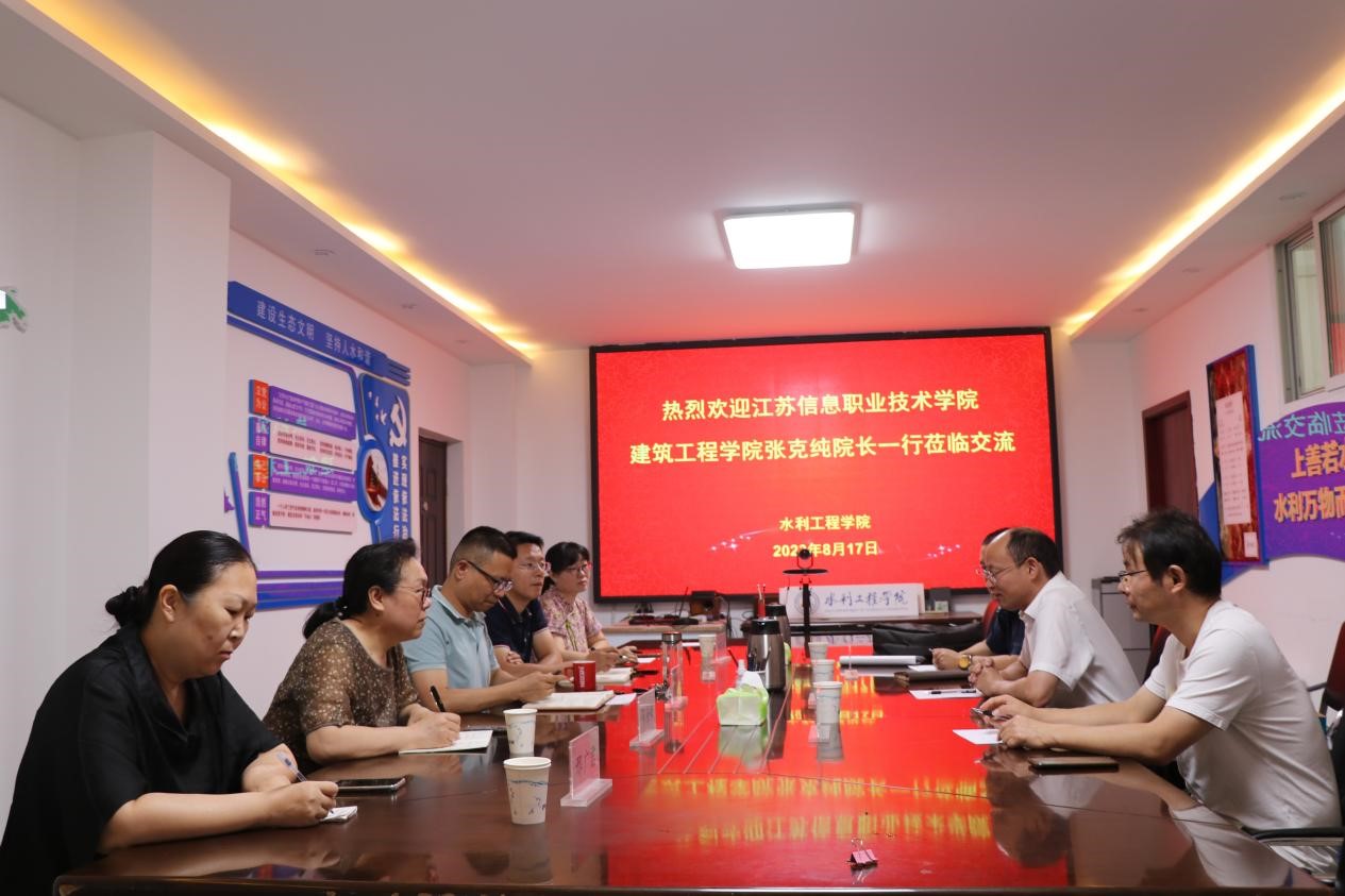 2023年8月17日上午,江苏信息职业技术学院建筑工程学院院长张克纯、骨干教师桑永良、丁晓华一行三人来水利工程学院进行调研,双方就专业建设、水利BIM大赛、专业交叉融合、专业发展等内容开展了深入的交流。