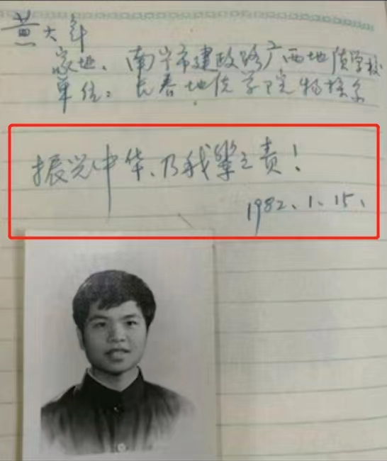 1982年1月15日,黄大年在给同学的毕业赠言中写道:“振兴中华,乃我辈之责”。
