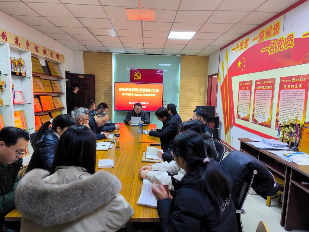 1月2日下午,水利工程学院党总支教工水工技术与管理党支部全体党员,在实训楼5306对习近平主席发表的2024年新年贺词开展了专题学习,学习由支部书记王建伟同志主持,支部全体党员参加了本次学习活动。