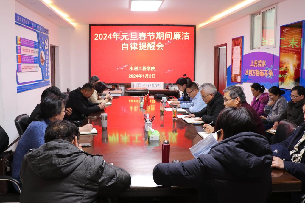 为贯彻落实中央办公厅、国务院办公厅和中纪委、省纪委《关于做好2024年元旦春节期间有关纪律通知》精神,根据学校纪委工作安排,1月2日下午,水利工程学院召开元旦春节期间廉洁自律提醒会,传达学校元旦春节期间有关正风肃纪工作的相关要求。水利工程学院党总支书记王建设、院长雷恒等全体班子成员、党总支办公室、行政办公室、校企合作办公室、各教研室、各专业、实训中心负责人参加了会议。会议由王建设主持。