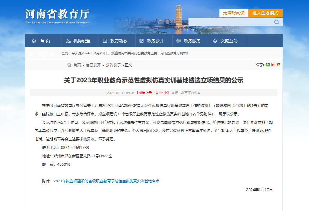 近日,河南省教育厅发布《关于2023年职业教育示范性虚拟仿真实训基地遴选立项结果的公示》,我校水利工程学院申报的“鲲鹏山智慧水利虚拟仿真实训基地”成功获批河南省职业教育示范性虚拟仿真实训基地建设项目。