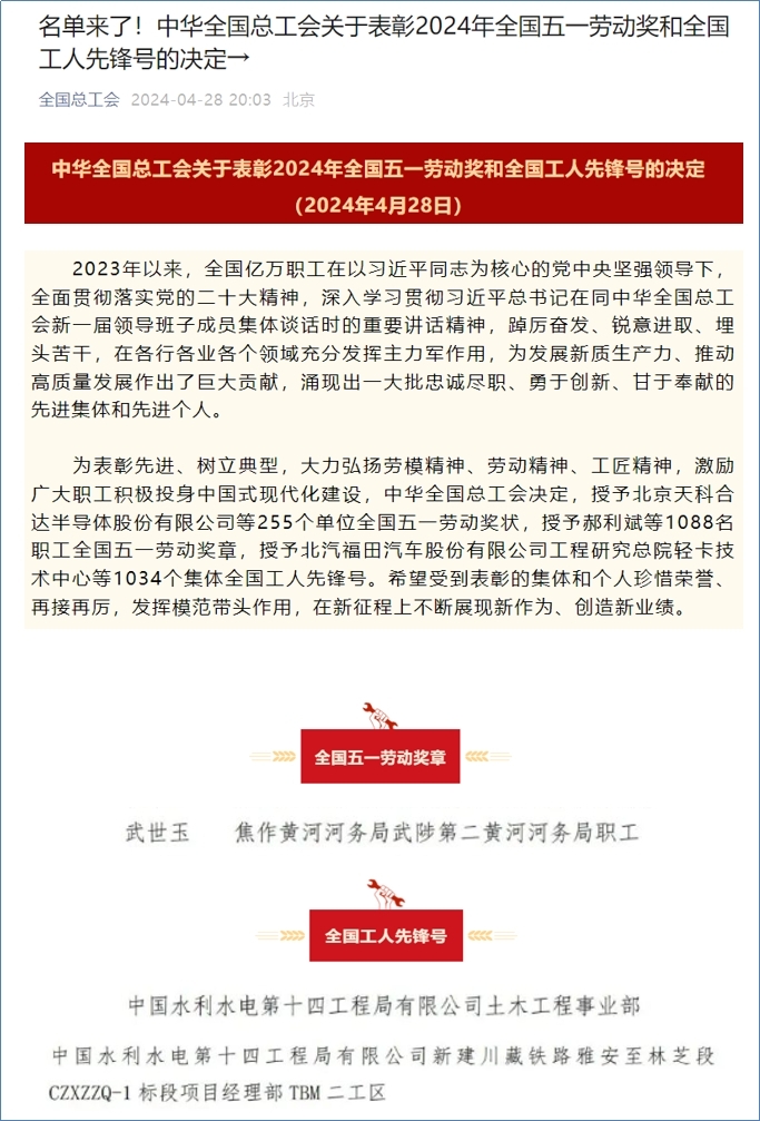 4月28日,中华全国总工会公布《关于表彰2024年全国五一劳动奖和全国工人先锋号的决定》,我校水利水电建筑工程专业2014届毕业生武世玉获全国五一劳动奖章。水利水电建筑工程专业2009届毕业生孙留阳任党委书记、总经理的中水十四局土木工程事业部,水利水电建筑工程专业1997届毕业生惠世前任党委书记、总经理及工程造价专业2009届毕业生倪耀文任副总经理兼总经济师的中水十四局轨道工程事业部所属新建川藏铁路雅安至林芝段某标段TBM二工区获全国工人先锋号。