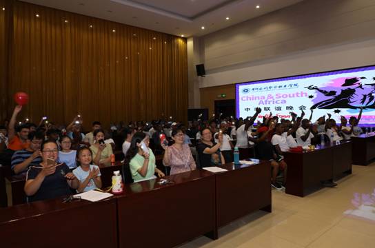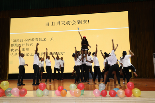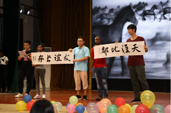 一段活跃的舞蹈拉开了晚会的帷幕,紧接着是中国武术表演《双节棍》、水利工程学院学生潘资杭、董世博同学倾情奉送的行楷《友谊长存,天涯比邻》书法展示,使南非留学生领略了我国深厚的历史文化底蕴,书法“友谊长存”现场赠送给南非留学生代表;南非舞蹈别具一格,将南非的传统文化表达得淋漓尽致,同时也表达了对黄河水院的热爱和感谢。胶靴舞《Gumboots》极具节奏感,舞蹈来自南非在移民劳工制度和压迫性种族隔离通行法实行期间在金矿工作的工人所创造的一种来源于生产生活的舞蹈;舞蹈《Sarafina》则诠释了中学生Sarafina代表的南非年轻一代黑人学子对民族自尊的正视,对自由的渴求以及对未来的期望。晚会中间穿插的《筷子夹球接力赛》,《猜词》等互动游戏,将晚会的气氛推向高潮;最后由先进成图技术培训小组的同学们的大合唱《朋友》充分展现了我院学子与南非留学生搭建友谊桥梁的迫切愿望,同时也表达了我院学子在新时代勇于展示自己,砥砺前行,共创美好明天的决心。晚会在气氛热烈歌舞中落下帷幕。
