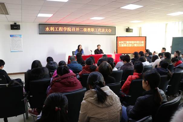 2019122日下午1430分,水利工程学院第二届一次教职工代表大会在SY5310召开。水利工程学院领导班子成员及全体教职工参会,会议由院党总支书记、分工会主席孙天星主持。