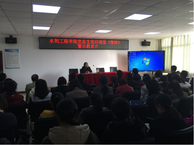 为响应国家廉政主题,不忘初心警钟长鸣水利工程学院于2018年12月18日下午,在实训楼5310开展了以“观看《警钟》警示教育片”为主题的会议。参加本次会议得有:水利工程学院党总支书记孙天星院长陶永霞及水利工程学院全体教职工本次会议由水利工程学院陶永霞主持。