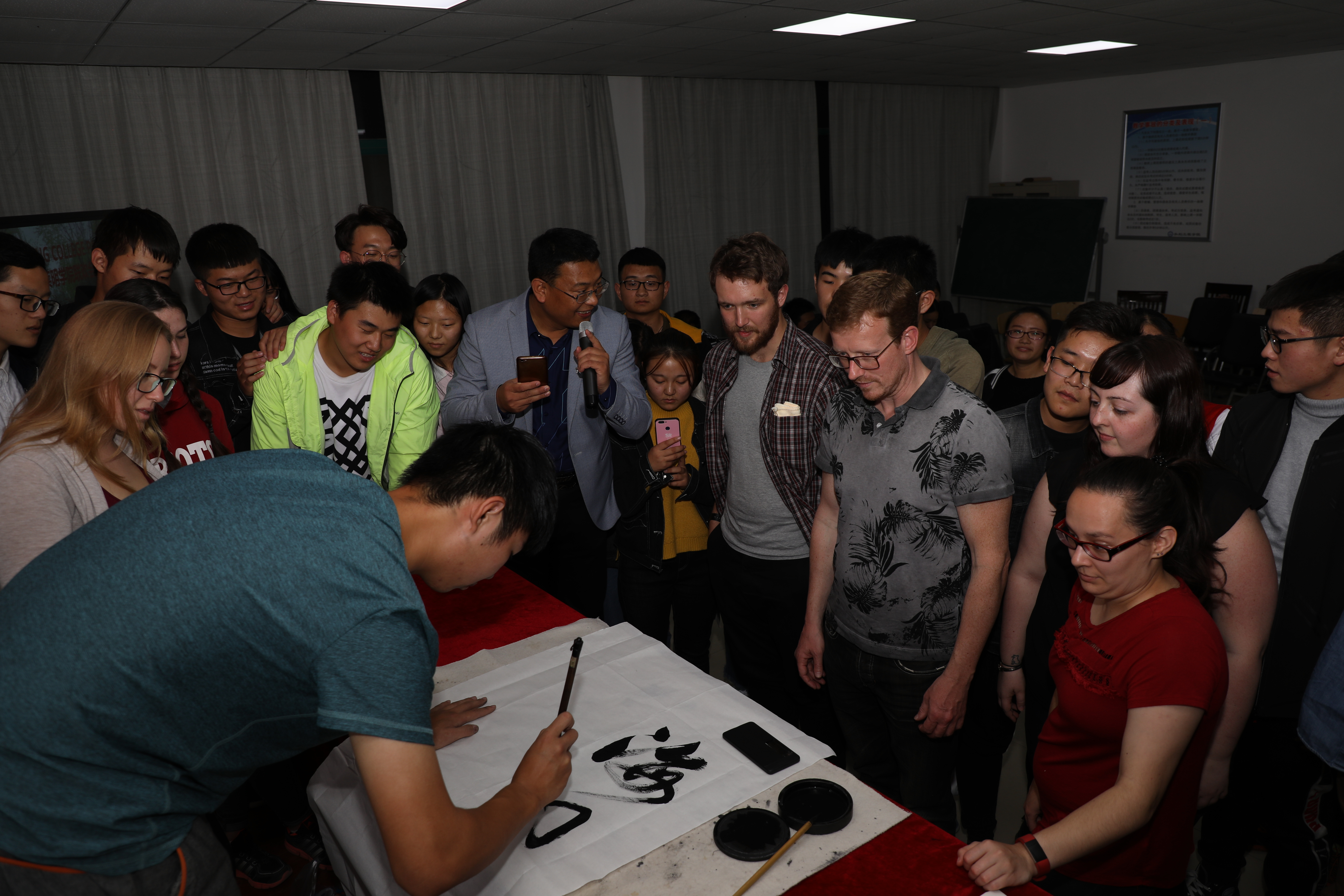 黄河水院CAD协会会长任浩铭用课件回顾了2016年弗莱明学院师生来访与水利工程学院师生参观鲲鹏山、包饺子、联欢晚会等在黄河水院渡过的美好时光;水工17级潘资航同学现场泼墨书写“海内存知己,天涯若比邻”,展示了中国书法的独特魅力,并将作品赠送给弗莱明学院;安娜与刘睿晨演唱了加拿大歌曲《hotline bling》以及集体节目《猜词游戏》、互动游戏《抢凳子》、集体舞蹈、大学生活互动分享、互送小礼物、合影留念、添加好友等增进了双方师生的相互了解,加深了友谊。