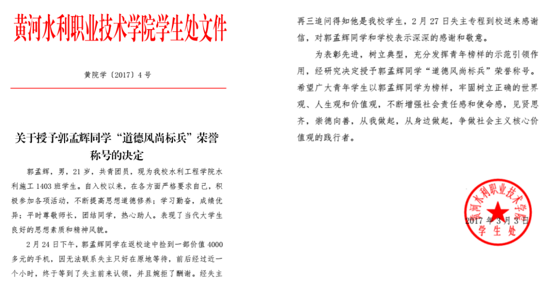 为表彰先进,树立典型,充分发挥青年榜样的示范引领作用,经研究决定授予郭孟辉同学道德风尚标兵荣誉称号。希望广大青年学生以郭孟辉同学为榜样,牢固树立正确的世界观、人生观和价值观,不断增强社会责任感和使命感,见贤思齐,崇德向善,从我做起,从身边做起,争做社会主义核心价值观的践行者。