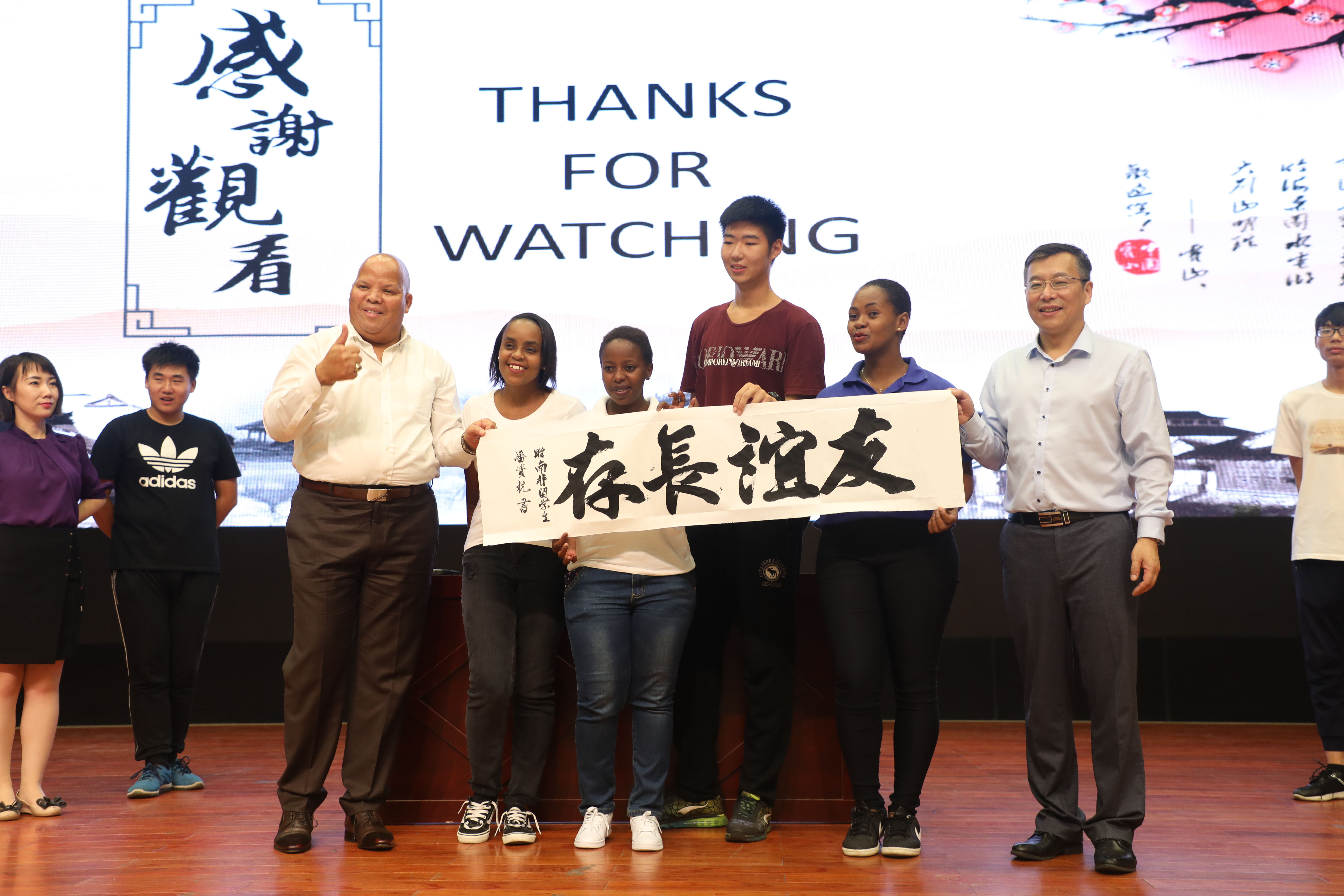 一段活力十足的开场秀拉开了晚会帷幕我院学生带来的武术表演《双节棍》书法表演等,使南非留学生感受了我国深厚的历史文化底蕴水利工程学院学生潘资杭泼墨书写“友谊长存”四个字,并将其赠送给Errol Randall Gradwell南非留学生表演传统舞蹈MANGO》别具一格,淋漓尽致地展现了南非的传统文化,也表达了南非留学生对黄河水院的热爱之情、对水院师生的感激之情。中间穿插的互动游戏将晚会气氛推向高潮大合唱《朋友》充分表达了我学子期待与南非留学生搭建友谊桥梁的美好愿望,以及在新时代不忘初心,砥砺前行,共创美好明天的决心。晚会在优美的歌舞表演中落下帷幕。