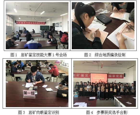 大赛共设置两个赛项:岩矿标本鉴定、手工绘制实测地质剖面图。赛项一要求学生对岩矿手标本进行鉴定并写出鉴定报告。赛项二要求各参赛人员根据地质教研组提供的资料,综合进行数据处理分析,按试题要求,独立完成竞赛。