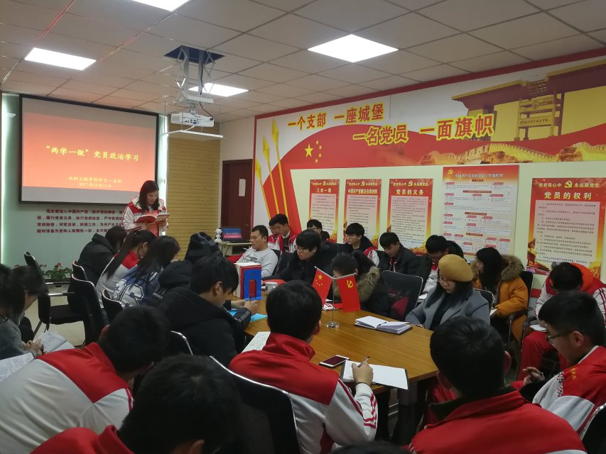 为进一步强化全员学习教育,着力推进两学一做常态化制度化,切实加强党的政治理论知识、理想信念教育等方面的学习,水利工程学院在2017年12月11日晚上7:00在水利工程学院党员活动室组织教工、学生党员开展“两学一做”政治理论学习。