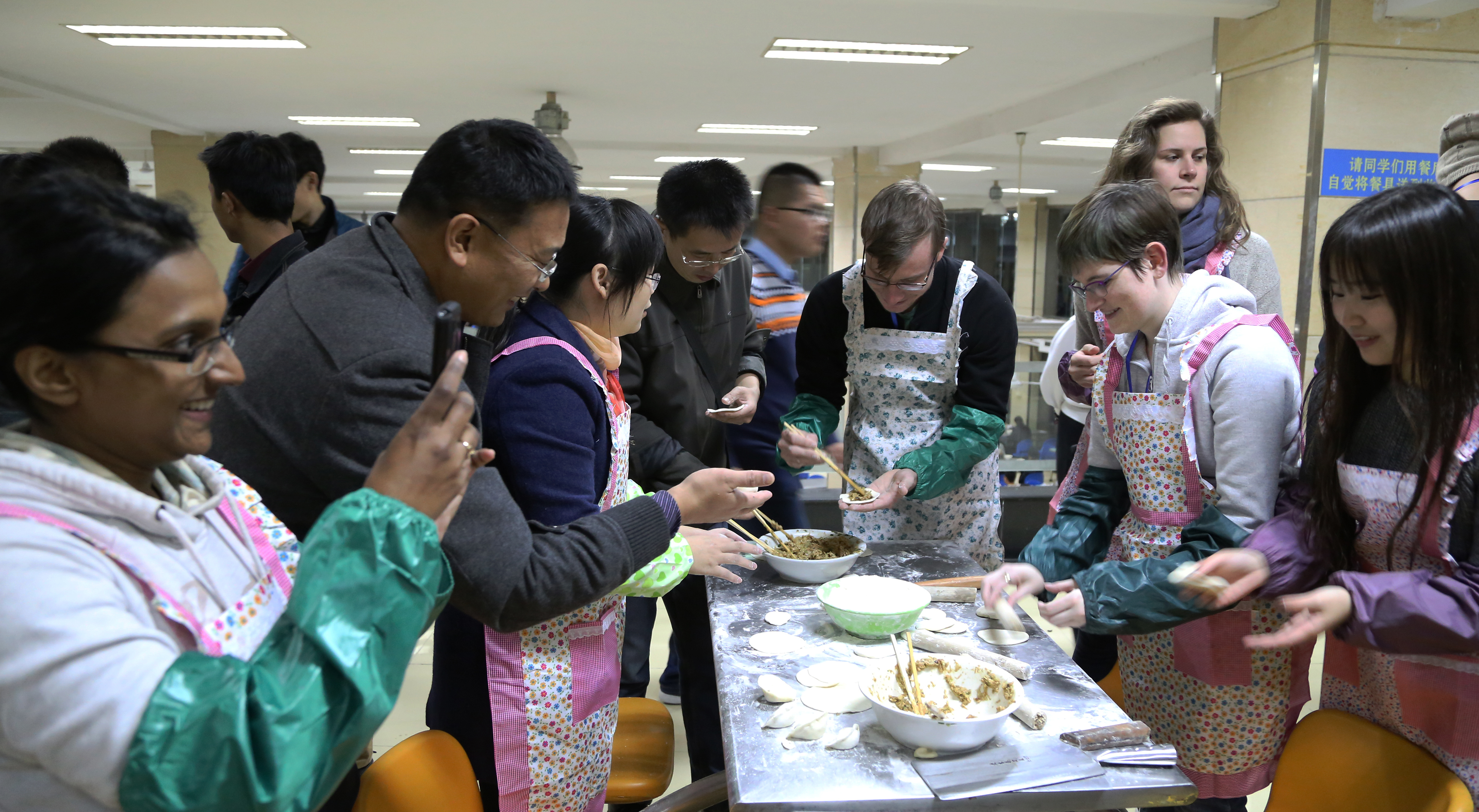 1031日下午6点,水利工程院国际工程专业方向的师生的师生在厅进行包饺子活动。晚餐后,在三号实训楼举行了联欢晚会。晚会主题是向客人展示中国优秀的传统文化,展示我校大学生风采以及丰富多彩的大学生活。大学生活介绍、猜词游戏、小品表演等节目增强双方师生的相互了解,增进友谊。