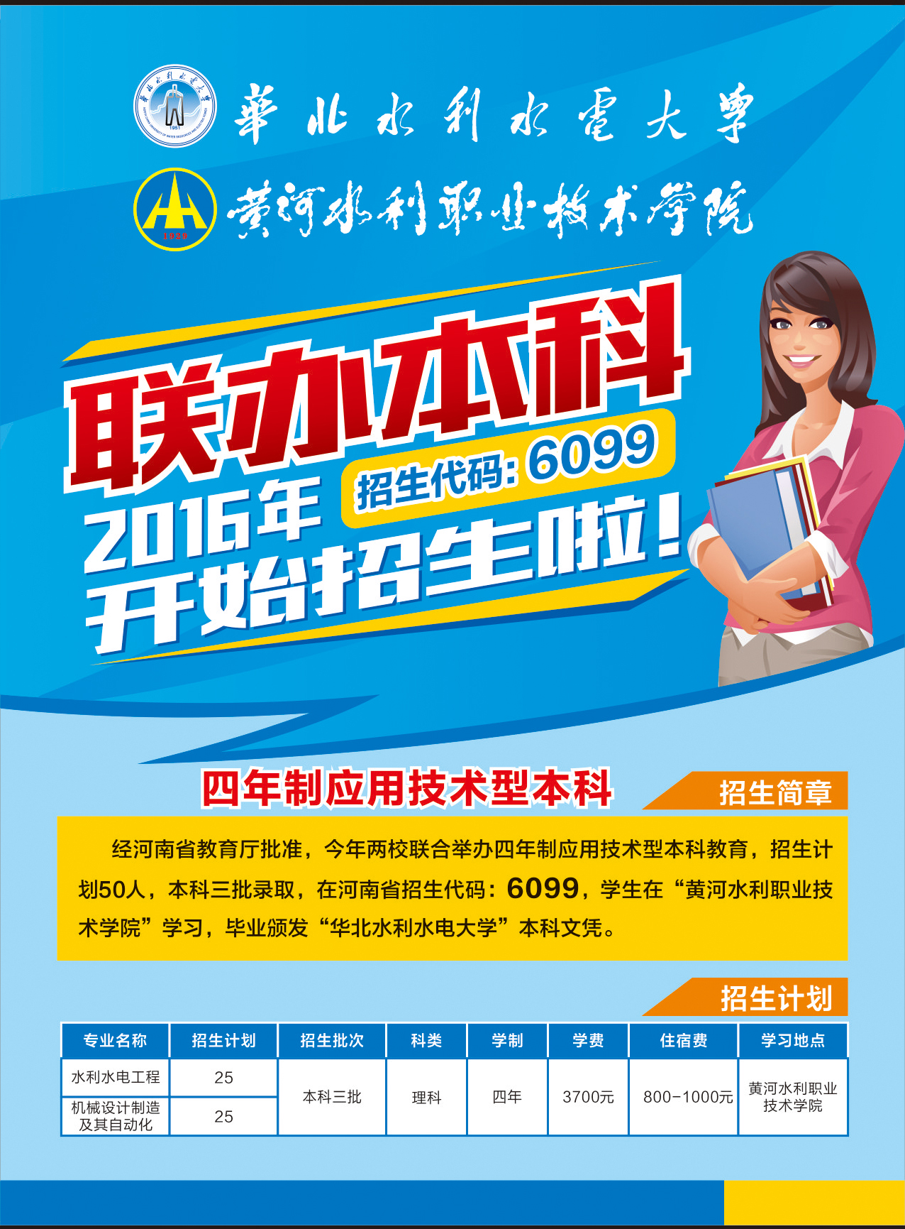 经省教育厅批准,今年我校与华北水利水电大学联办四年制应用技术型本科,专业为水利水电工程,招生计划25人,招生科类为理科,学制四年,学费3700元/年,在本科三批录取,招生代码6099,学习地点在我校,毕业颁发“华北水利水电大学”本科毕业证、学位证。